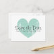 Turquoise blue heart save the date postcards for wedding. Vintage weathered love symbol with elegant script text for bride and groom names plus date. Cute romantic illustration design personalized with your message for guests. Customizable background colour ie white. Rustic country chic print for classy marriage party.