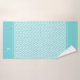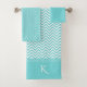 Stylish bath towel set done in turquoise blue and white, with polka dots and chevron patterns decorating the bath towel and the hand towel. The wash cloth is done in a solid turquoise. Personalize the white one letter monogram, on the bath towel to suit your needs.