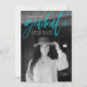 Modern graduation announcement card featuring your graduate's favorite photo on the front with "Graduate" in a turquoise handwritten script. Personalize the front of the announcement by adding the graduate's name, school name, and graduation year. The trendy graduation announcement reverses to display an additional 3 photos with space for text such as future plans, graduation details, party details, etc. The 4 photo graduation announcement is perfect for both high school and college graduates.