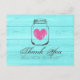 Grange bleu turquoise panneau à grains de bois pays chic pot en verre de mason merci cartes. Amour et merci ! Partie de l'ensemble de do-it-yourself rustique. Design extérieur mignon avec coeur vintage rose défraîchi. Idéal pour les mariages d'été dans les jardins extérieurs en juillet et août. Egalement agréable pour le thème de la plage. Personnalisez avec le nom de la mariée et du marié plus la date de mariage. Couleur arrière - plan personnalisable. La typographie stylée de script en détresse. Belle oeuvre d'art pour mariage tendance. Aqua et gris foncé.