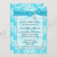 Elegant turquoise and white damask Quinceanera Birthday Invitation. Graphics of a pretty turquoise ribbon and bow decorates the top of the invitation, with real looking graphic diamond accent on the bow. A delicate ornate white framed text area has black text ready to personalize for your daughters 15th birthday celebration.