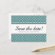 Enregistrez simplement les cartes postales de date avec motif pois turquoise et blanc. Design d'impression polkadot chic moderne pour une soirée de mariage élégante. Style contemporain tendance et ludique. Couleur arrière - plan personnalisée et texte modèle personnalisé au dos. Changez la quantité pour obtenir le prix le moins cher par carte.