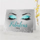 Turquoise Fabulous Glitter Eyes Large Birthday Card features a pair of large eye lids with turquoise glitter effect eyeshadow, diamante effect liner with long black lashes on a silver glitter effect background. The word 'fabulous' is written in script in a matching turquoise color with a small silver queen's crown hanging from the top of the loop on the 'L'. 'Have A' and 'Birthday' in written in black smaller script above and below the word fabulous. The inside of the card is white and on the inside back there is a small silver queen crown. On the outside back the background is the same silver glitter effect as the front and a small pair of the same turquoise glitter effect eyes and black lashes are at the bottom center.
