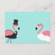 A wedding details enclosure card in turquoise with black text and a flamingo bride and groom on the back. Place your information on this card, add it to your cart, then send it to your guests.