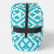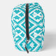 A turquoise geometric quilt pattern featuring stylized flowers within a diamond frame, bordered by zigzag shapes.