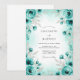 This design showcases a delicate watercolor border of teal roses and anemones, accented by soft gray leaves. The ethereal aqua wash creates a tranquil and romantic mood for a sophisticated seasonal event. It captures the essence of a blooming botanical display with a cool-toned and refreshing color palette.