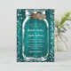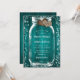 Faire-part de mariage turquoise rustique avec un bocal de maçon et des coeurs de burlap sur un arrière - plan en bois de grange. Personnalisez facilement ce faire-part de mariage de bocal de maçon avec vos détails mariages.