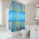 Turquoise, Green, and White Stripes Bath Shower Curtain. A blue, monogrammed modern, chic, and contemporary pattern design to enhance your decor for the master or guest bathroom. Change the monogram, background colour, or just enjoy the pattern. Complimentary towel sets, bath mats, and accessories available.