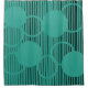This shower curtain has a mid-century modern design of black vertical lines with circles scattered on top on a field of turquoise.