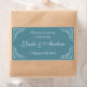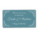 Fête de mariage florissante et torride, préférez les étiquettes de bouteille d'eau. Autocollants turquoise bleu et blanc personnalisés avec coins tourbillonnant. Modèle do-it-yourself personnalisé avec typographie stylisée de calligraphie. Design vintage chic avec le nom de la mariée et du marié plus la date du mariage. Utilisez l'eau de source comme décor de table classe ou merci pour les invités à la fête. Couleur arrière - plan personnalisable pour correspondre à votre thème. Merci de partager notre journée spéciale. Aussi agréable pour un dîner de répétition mariage, fiançailles, bachelorette, anniversaire, douche nuptiale etc. Peut également être utilisé pour les bouteilles de vin.