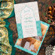 Our Moroccan inspired wedding invitations with a beautiful turquoise arch and floral wooden textue colour block are the perfect choice for a unique and unforgettable wedding celebration. Get ready to impress your guests and set the tone for your big day, featuring pretty initials, add 3 of your photos, the colours are fully editable. Perfect for exotic, tropical destination wedding.
