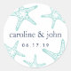 Coastal chic stickers for your wedding invitations or favours feature your names and wedding date in navy blue lettering, flanked by vintage style starfish illustrations in vibrant turquoise aqua.