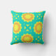 Vibrant throw pillow design featuring a seamless pattern made of geometric shapes in orange and yellow on a turquoise background.