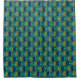 This shower curtain has a mid-century modern design of ovals in teal with semi-circles in green and navy inside them on a field of turquoise.