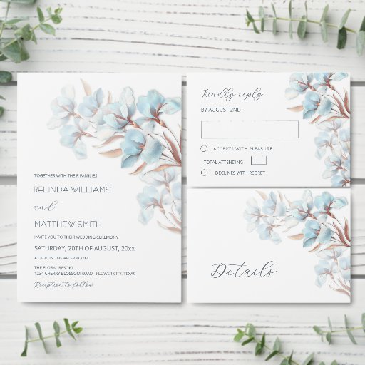 A modern and elegant wedding invitation featuring beautiful layered paper flowers in soft blue tones. The delicate 3D effect and airy composition create a sophisticated look for your special day. Fully customizable for your unique celebration.