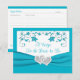 This pretty bridal shower recipe card matches the turquoise blue and white bridal shower invitation and assorted stationery shown below. This pretty bridal shower recipe card features a turquoise or teal blue and white colour scheme and has a blue ribbon with an image of a pair of joined hearts on top of it. Turquoise flowers and vines cascade down from the top and surround the blue text that says, "A Recipe For the Bride-to-Be" in blue script. The back side has room to add a recipe of your choice to bring to the bridal shower.