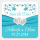 This pretty turquoise blue and white wedding save the date envelope seal has turquoise or teal blue flowers and vines across the top on a white background with a turquoise ribbon and romantic joined hearts images made up of silver glitter and round crystals across the centre with the names of the bride and groom and the wedding date in white below. If you need any additional matching items, please email your request to niteowlstudio@gmail.com or use the Zazzle chat feature to get in touch.