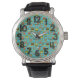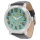 This men's watch has a mid-century modern design of rounded rectangles in shades of green and brown with holes in them on a field of turquoise. If you like the design but prefer different colours, message me.