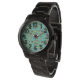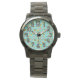 This women's watch has a mid-century modern design of rounded rectangles in shades of green and brown with holes in them on a field of turquoise. If you like the design but prefer different colours, message me.