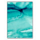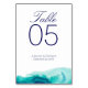 A modern and elegant watercolor wedding table number, features an abstract turquoise sea, all your details are spelled in a mix of modern and script typo.