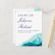 A modern and elegant watercolor "save the date" postcard, features an abstract turquoise sea, all your details are spelled in a mix of modern and script typo.
