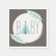 A gift featuring an illustration of a turquoise teepee incorporated into text, "Baby." with feathers. Background is wood inspired.