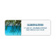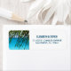 Address labels with a beautiful photograph of a turquoise tropical beach with large green palm fronds framing the scene.