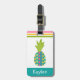 Bring a bit of the hospitality of Hawaii and pineapples with you wherever you travel, when you use this chic, striking, stylish, modern custom name luggage tag. A fun, modern, graphic, turquoise blue, green, pink and orange pineapple and pink, orange, and green stripes, along with your name on a turquoise blue band, overlay white. Makes a fun and stylish statement every time you use it. A great gift for a friend, as well as yourself!