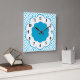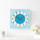 This is a pretty clock with a turquoise and white floral stencil background, and a scalloped edge white and turquoise layered field for the easy to read numbers.