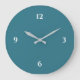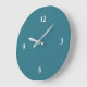 Modern clock features a minimalist design in a turquoise and white colour palette. A simple plain design with white numbers on a turquoise background.