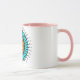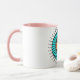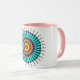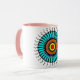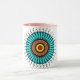 A beautiful ceramic mug featuring a vibrant turquoise and orange mandala design. This intricate circular pattern brings a sense of peace and artistic flair to your favorite beverage."