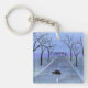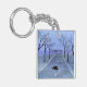 A watercolor painting of a silhouetted turtle crossing a road adorns this customizable keychain!