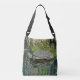 This cross body tote bag is especially designed for anyone who loves turtles. Both the front and back of this tote bag features a relaxed turtle sunning on a rock next to the water. Tall reeds and bright green moss provide the background for this lake animal. The turtle and the plants are reflected in the water.