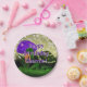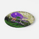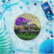 Sparkly Turtle paper plates with Happy Birthday and personalized text. Purple and gold with sparkles, mushroom and turtle.