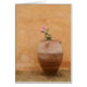 A ceramic urn flower pot with a pink rose against a rustic orange coloured wall.
