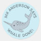 A cute narwhal on a light sea blue background. The text reads "Mx Anderson Says Whale Done!" and can be changed for a custom name/message. Ideal for teachers as rewards for students.