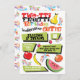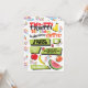 Retro and fun Two-tti Fruitti birthday party invitations with colourful fonts, pear, watermelon, apple, banana, orange and strawberry fruits.