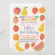 Jetez un doux bain d'été avec cette invitation tutti frutti anniversaire! Emballé d'illustrations fruitées de fruits tropicaux, comme des bananes, des fraises, des ananas et des agrumes, ce design gai est parfait pour une fête d'enfants avec une touche fruitée. Idéal pour les anniversaires en plein air, les soirées splash ou les thèmes tropicaux. Entièrement modifiable pour correspondre aux détails de votre événement!