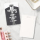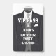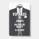 Fun bachelor party accessory badge with graphics of a formal tuxedo. Personalize the white text fields to suit your needs.