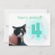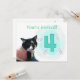 Painting of the number four in green with pink swirl ribbons, with a photo of our black and white tuxedo cat wearing a pink and white striped dressed, with You're invited, is printed on birthday party invitations. Easily customize the text on both sides, on the template forms.