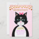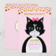 Birthday party invitation card with a lovely tuxedo cat as a messenger with gold confetti as a header on pink background. All text ready to be customized.
