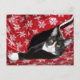 Black and white tuxedo kitty cat makes himself comfortable in the Christmas wrapping paper with typical cattitude cat lovers holiday postcard