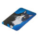 Portrait painting of a black and white tuxedo cat with yellow eyes. The cat faces the viewer looking slightly off to one side in a regal cat pose. The cat's pet portrait is accented against a royal blue background. Customize this cool cat art portrait magnet with your own personalized text and images to make special cat lover gifts!