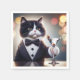 A sophisticated tuxedo cat in a tuxedo holds a martini glass with olives, exuding a sense of elegance against a blurred background of colourful lights