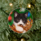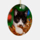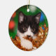Cute black and white tuxedo kitten has found the Christmas decorations and is playing with, or eating, the garland cat lovers Christmas ornament