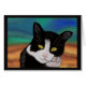 Graphic illustration of Tuxedo the Cat relaxing against the dark green and orange horizon.