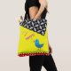 A blue Bird "Tweet, Tweet, Tweets" on this cheerful, playful, youthful tote bag. Suitable for playful people of any age. Especially those who "tweet" on Twitter. Fuschia lettering on a lemon yellow field, interjected by irregular shapes of red and white polka dot-pattern and black and white diamond tile pattern. The back, while less splashy, has some fun dot-play.