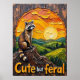 This vibrant painting features a raccoon with fluffy brown and white fur and a curious gaze, perched on a rocky outcrop. Behind the raccoon, a stylized sunset illuminates a rolling green valley under a textured orange and yellow sky. The artwork has a thick, impasto style with bold, textured brushstrokes. The text "Cute but feral" is painted in a stylized yellow font at the bottom of the image.