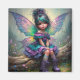A whimsical fairy girl with sparkling butterfly wings sits gracefully on a mossy log in an enchanted forest. Her ruffled dress blends rich shades of purple, teal, and lilac, matching her streaked hair and glittering wings. The magical atmosphere is filled with glowing flowers and dreamy light, capturing the serene beauty of a twilight forest.