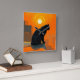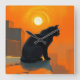 A sleek black cat perched atop a rooftop silhouetted against a blazing orange sky. The setting sun casts a warm, golden glow, creating a striking contrast with the cat's dark fur. The feline's calm yet watchful gaze hints at a mysterious narrative, as it surveys the quiet cityscape below.